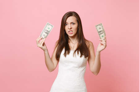 Portrait of concerned upset bride woman in white wedding dress holding one dollar bills isolated on pastel pink background. Lack of money. Organization of wedding celebration concept. Copy space