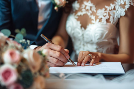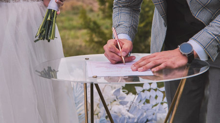 Groom signing wedding certificate on glass surface, bride nearby holding floral bouquet during outdoor marriage event