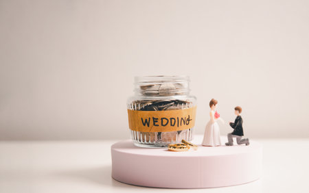 Save money for wedding and planning wedding concept. Sustainable financial goal for family life or married life. Miniature wedding on rows of rising coins, depicts savings or growth for new family.