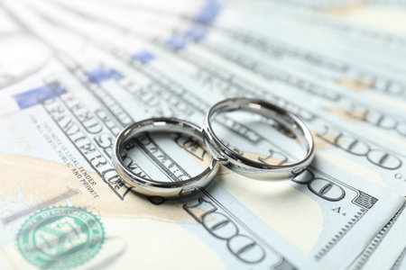Two silver wedding rings on dollar banknotes, closeup