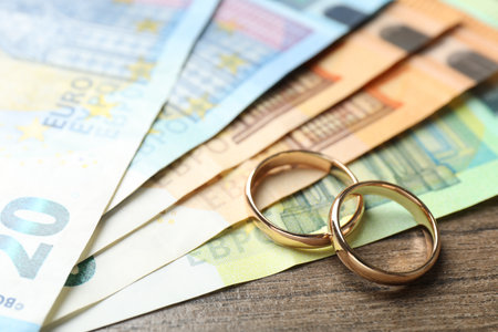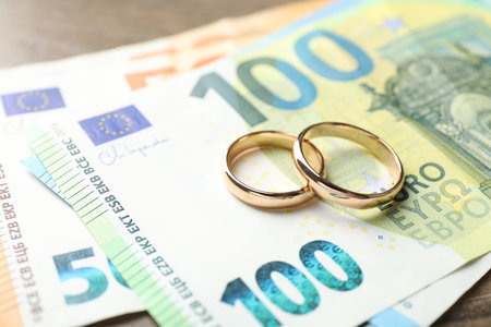 money and euro banknotes with two wedding rings in gold are on top of the pile