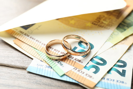 Gold wedding rings, envelope and euro banknotes on wooden table, closeup