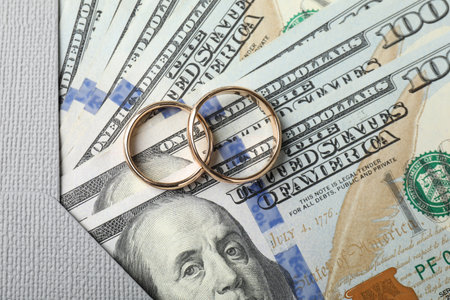 Two gold wedding rings on dollar banknotes, top view