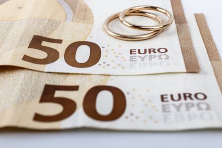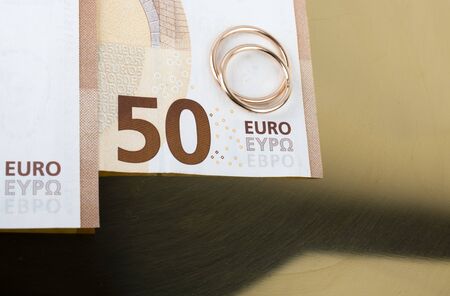 Two wedding rings and currency. Wedding rings and fifty euro. Wedding or divorce concept. Wedding Planning concept. Expenses.