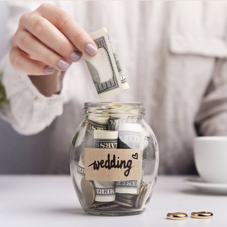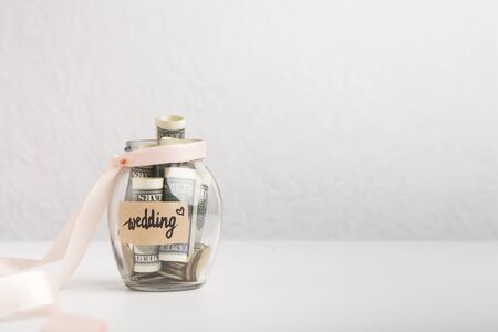 Wedding word with dollars in glass jar, Savings for budget concept, gray background, copy space