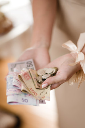 Concept of wedding cost. Golden ring and money on bridal dress closeup