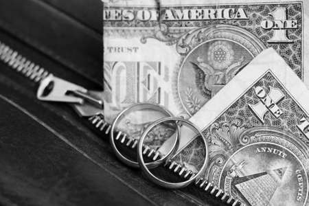 Two wedding rings and currency. Wedding rings and one dollar. Wedding or divorce concept. Wedding Planning concept. Expenses.