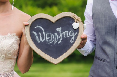 Romantic couple holding heart outdoors. The plate with the inscription closeup. Bride and groom holding wooden plate for inscription. Sign in the form of heart with words wedding.