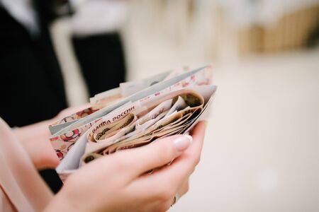 A bundle of Russian paper money is in an envelope close up. Salary in an envelope. Black salary