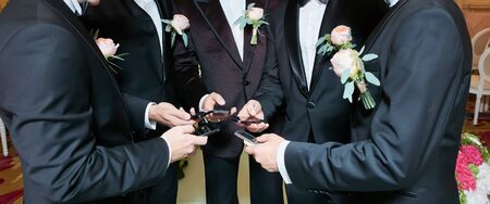 Group of groomsman standing in circle and using phones.