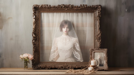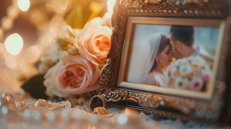 Showcasing a couple in love, this elegant arrangement highlights wedding accessories, including a stunning bouquet and delicate rings.