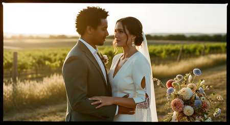 A tender moment between a bride and groom in a vineyard at sunset, with the warm light casting a golden glow on their faces and elegant wedding attire.