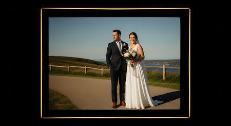 A smiling bride and groom stand together on a paved road, surrounded by a serene landscape with a wooden fence, rolling hills, and a vast ocean view under a clear blue sky.