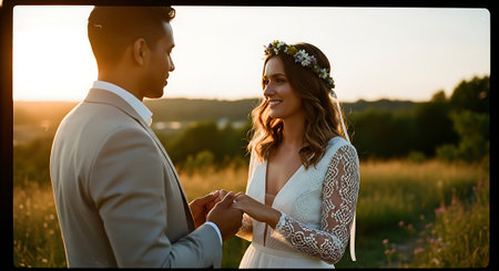 A man and woman in wedding attire stand in a field, holding hands and smiling at each other during a beautiful sunset with a serene landscape in the background.