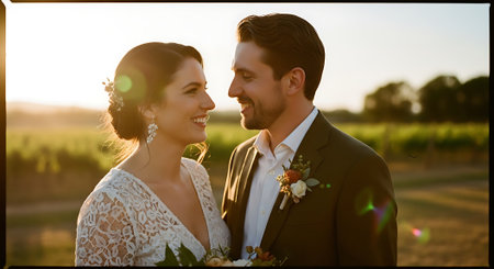 A smiling bride and groom stand together in a vineyard at sunset, with the bride wearing a white lace dress and the groom in a dark suit with a flower boutonniere.