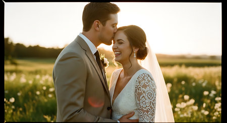 A smiling bride and groom share a tender moment in a serene field, with the bride leaning her head on the groom's shoulder, both dressed in elegant wedding attire.