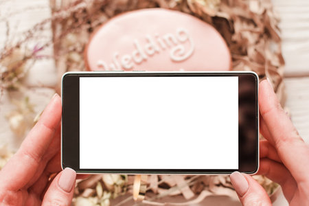 Woman taking photo of pink wedding cookie on white wooden table background. Smartphone mockup with blank screen. wedding guest report from celebration concept