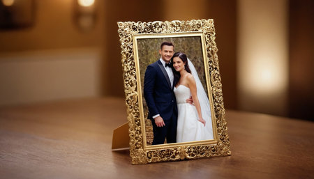 Hands holding cherished black and white wedding photographs on a wooden background