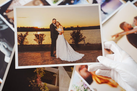 hands in white gloves and Beautiful printed wedding photos.