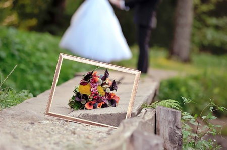 Detail of frame and floral wedding bouquet with bride and groom on bokeh background