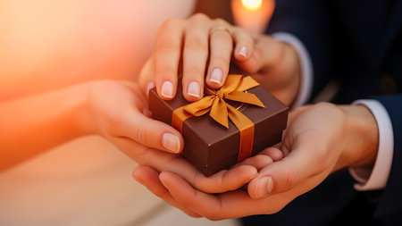 A romantic wedding moment. Hands unwrap an elegant white and gold gift amidst the beautiful blur of reception decorations, full of love and joy.