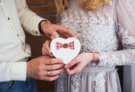 Romantic couple holding gift box in form of heart in their hands against brick wall. Valentine Day present.