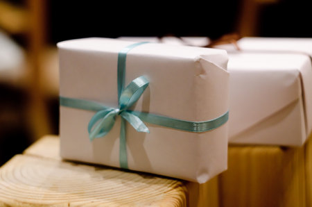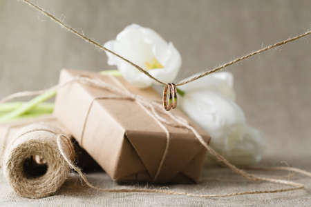 High angle view of wedding gift wrapped in eco paper papckaging and flower decoration.