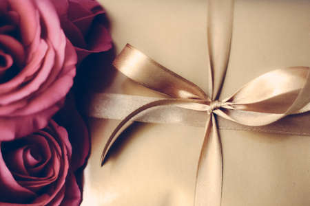 Vintage design, shop sale promotion and happy surprise concept - Luxury holiday golden gift box and bouquet of roses as Christmas, Valentines Day or birthday present