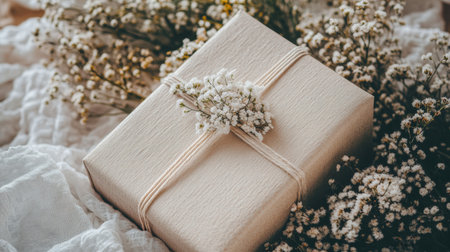 A stunning gift box wrapped in simple elegance, adorned with delicate white flowers, resting on soft textured fabric, creating a serene atmosphere.