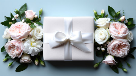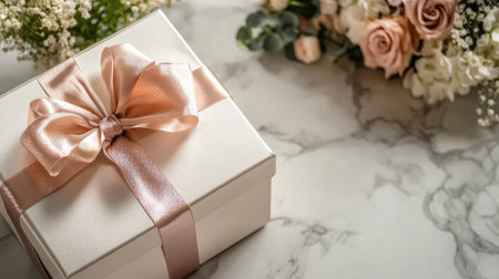 A luxury gift box with a satin bow, placed on a marble countertop next to a bouquet of flowers