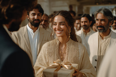 Joyful woman is receiving a beautifully wrapped gift, surrounded by smiling friends at a festive celebration, creating a warm and inviting atmosphere.