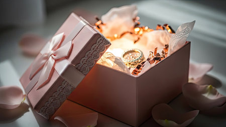 An open pink gift box contains jewelry, illuminated by warm lighting. The scene features delicate rose petals, suggesting a romantic indoor setting. The image uses soft focus, creating a dreamy feel. Suitable for editorial use, or for projects related to gifts, love, and special occasions.