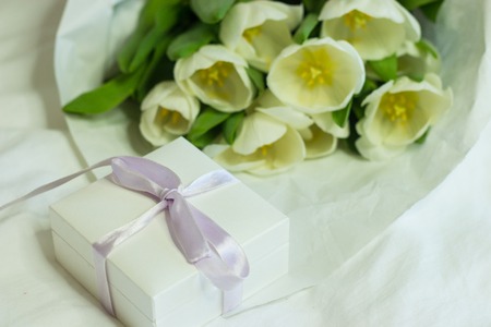 Gift box and a bouquet of white tulips on a bed. Holidays. Spring.