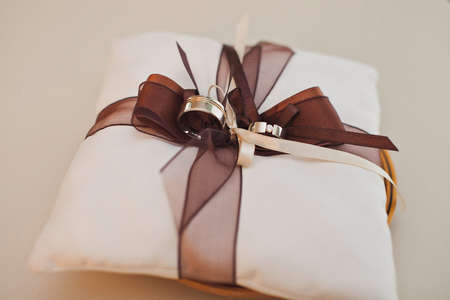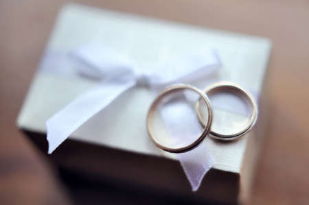 Classic wedding rings (band set) on the white box. Golden wedding rings on gift box