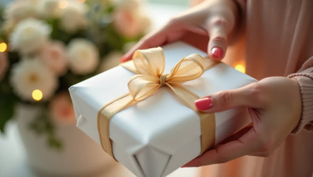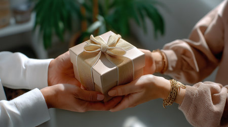 Tender gesture unfolds as a woman hands over a carefully wrapped gift, filled with warmth and joy.