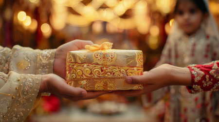A child's hands present a golden Eid gift, capturing the essence of sharing and generosity during the festive occasion.