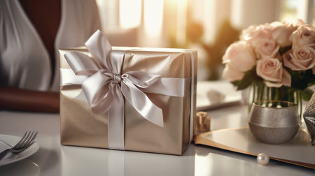 A carefully wrapped gift rests on a beautifully set dining table, surrounded by floral centerpieces and soft candlelight, evoking an atmosphere of celebration and warmth.