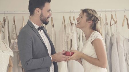 Happy bride and groom in wedding dress prepare for married in wedding ceremony. Romantic love of man and woman couple.
