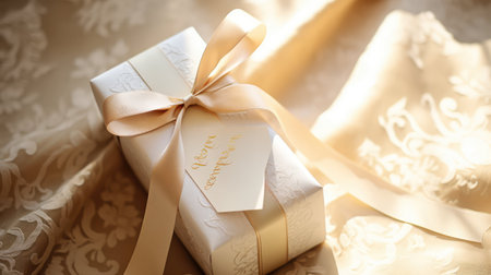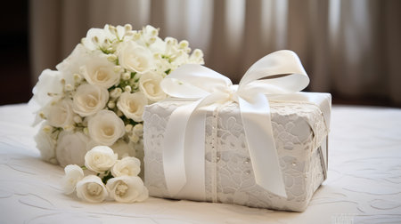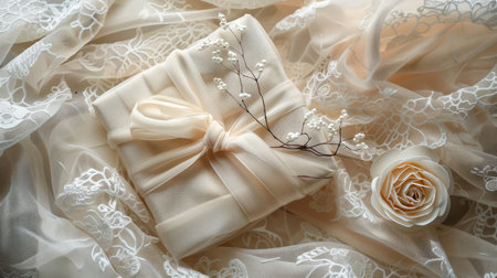 Elegant Bridal Fabric and Gift Box with Satin Ribbon on Ivory Lace Background for Wedding Themes AI Generative
