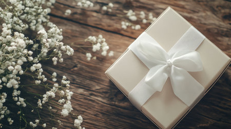 Gift box with white ribbon and gypsophila twigs on a textured wooden surface generative ai