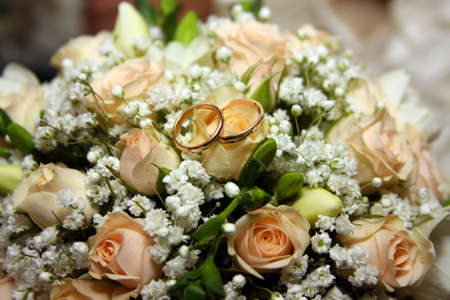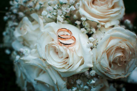 Gold wedding rings lying on the white bouquet of flowers