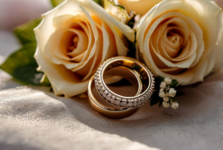 Two rose gold wedding rings rest on a sparkling backdrop. A symbol of love and commitment.