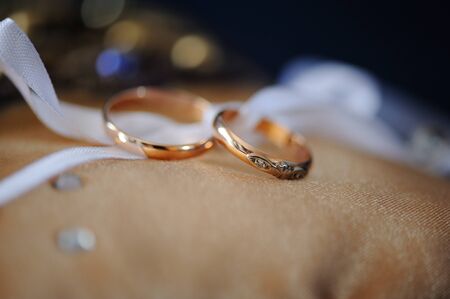 Wedding rings, on a golden fabric background