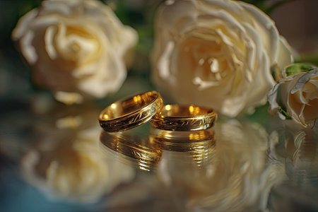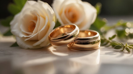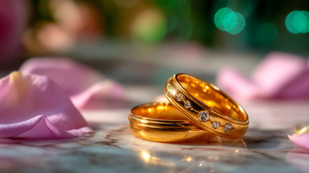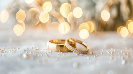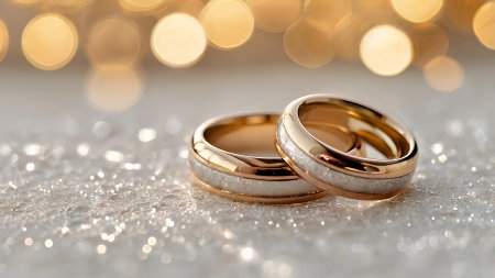 Two golden wedding rings rest on a sparkling background, symbolizing love and commitment.