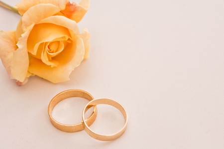 Wedding rings on a cream background with a yellow rose