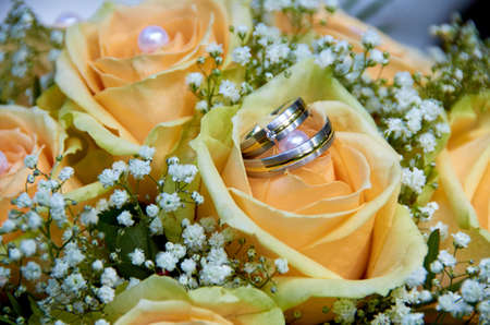 Wedding rings on a bridal bouquet