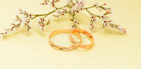 Gold wedding rings and branch flowers. Holiday postcard yellow textured old paper