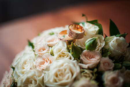 gold rings and a beautiful bridal bouquet of roses on the background. details, wedding traditions. close-up, macro