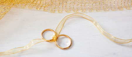 A pair of golden wedding rings tied with a golden ribbon on white wooden background