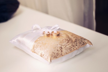 Pair of gold wedding rings on a pillow.